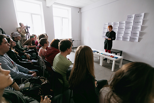 Важно отметить, что Лиза Морозова в последнее время в большей степени занимается преподавательской деятельностью, и этот перфоманс придумала и создала специально для фестиваля DOCA, вдохновившись темой этого года «Временно». Кроме того, все перфомансы Лизы уникальны – она очень редко повторяет тот или иной проект, так что зрители присутствовали при уникальном событии. On 1 April 2018, IGUMO held a performance by Liza Morozova as part of DOCA 2018 festival. She is one of the most famous performance artists in Russia. Liza Morozova deals with performance as an artist, art-therapist, and lecturer. In the 1990s, she worked as a member of Zapasnoy Vykhod art collective. In the 2000s, she worked with ESCAPE group representing Russia at the Venice Biennale. In 2005, she defended thesis on performance. Since 2004, Liza Morozova has been running her own project titled Performance Art Studio. Since 2015, she has been a course master of Performance School PYRFYR, project of the Na Solyanke gallery. Participant of more than 170 exhibitions in different countries, including the Moscow Biennale, the Prague Biennale, the Thessaloniki Biennale, and PERFORMA. Nominee of the Kandinsky prize, the Moscow Biennale prize, and the Boris Nemtsov prize. One of her most famous lines in art is a series of performances based on her diaries. Ms. Morozova keeps them for 30 years. The artist created a special project related to her diary series for DOCA 2018. Performance was called ’21st of April’ and focused on that day in both collective and personal history of Liza Morozova. She gathered all her records dated 21 April from 1986 to 2018, and information on the events, which happened on that day in different years. As a result, Ms. Morozova created an installation of pages, diaries and papers with dates. Throughout her performance, she read her notes. In the end, Liza made a new one about the festival. It resulted in a time capsule. The performance compared the past and the present, personal time and collective history.