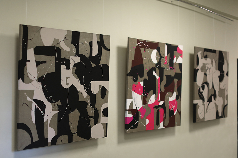 Интеграция символического знака в абстрактную живопись переводит языковую конкретику в поле открытого произведения. Абстракция и буква переплетаются. Нереферентная визуальная форма перенимает качества графического шрифта, приобретает схваченность, цельные, жесткие очертания. Текст же переходит в область, открытую потенциальным интерпретациям. Его визуальная конструкция, плоскостность увлекают своей сложносочиненностью. Само тело текста становится референтным, одновременно отсылает к типографским экспериментам прошлого века и к современной компьютерной графике.Ольга Рикун |